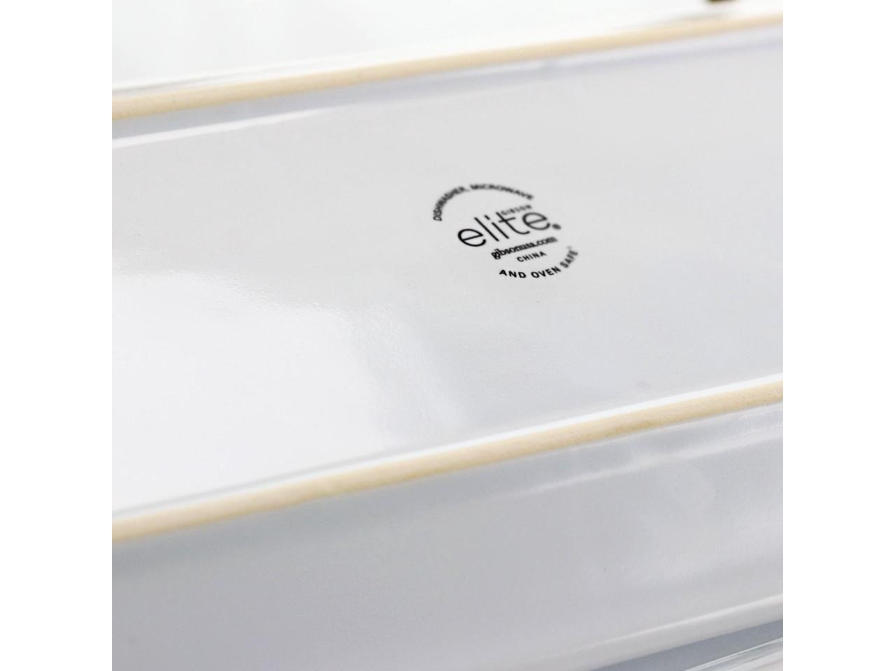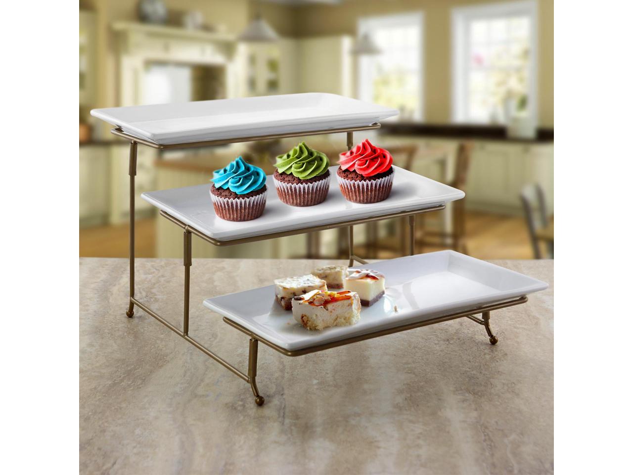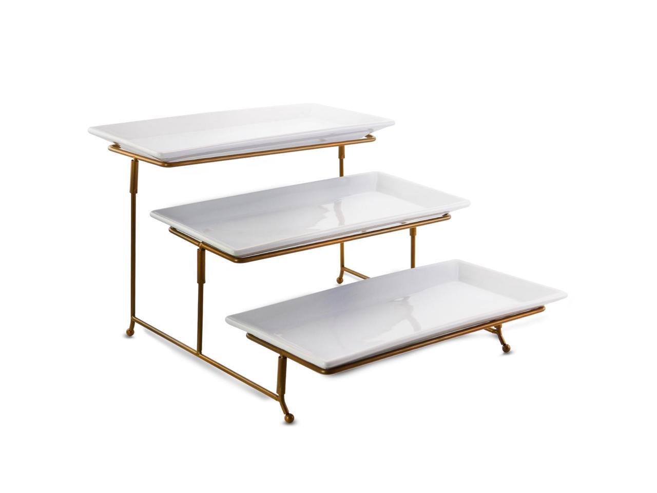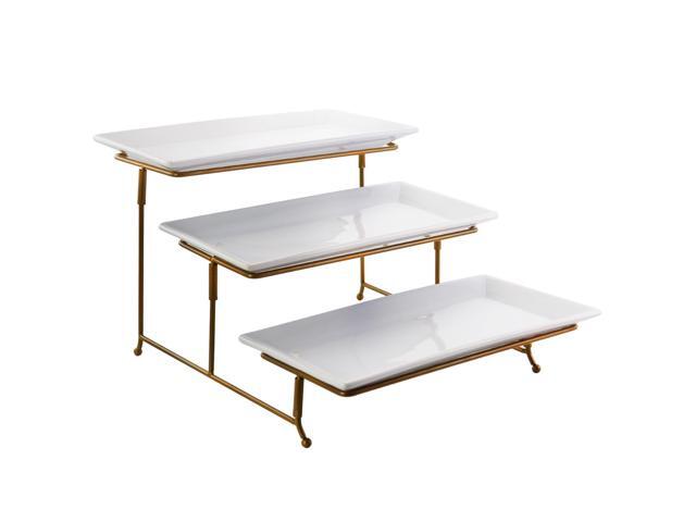 Gibson Elite Gracious Dining 3 Tiered Rectangle Porcelain Plate Set with Gold Metal Stand