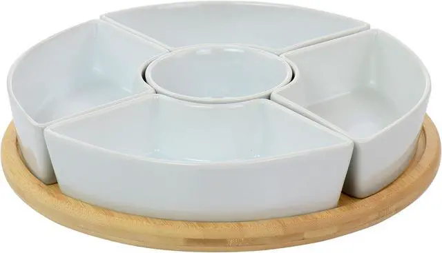 Serve up the perfect party platter with the Gibson Elite Gracious Dining 6 Piece Tidbit Dish Set with Rotating Wood Base. Features a dip bowl that is surrounded by removable snack dishes. These fine ceramic pieces perfectly nuzzle into the included rotating wood tray. The serverware set is dish washer safe and microwave safe and the wood base must be wiped clean with a damp cloth. Ideal for serving a variety of chips, an array of veggies, or other finger foods with your choice of dips at the center.
