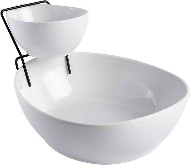 Add some style and charm to your next party or get together with this Gibson Gracious Dining 3 Piece 2 Tier Fine Ceramic Chip and Dip Serving Set. In this set, you'll receive a large, oblong bowl perfect for all kinds of chips and snacks, and a smaller bowl which is attached at the top by a wire rack perfect for any dips or other complimentary items. Made from sleek fine ceramic, these dishes are dishwasher and microwave safe making them easy to use and clean up, the wire rack is hand wash only.