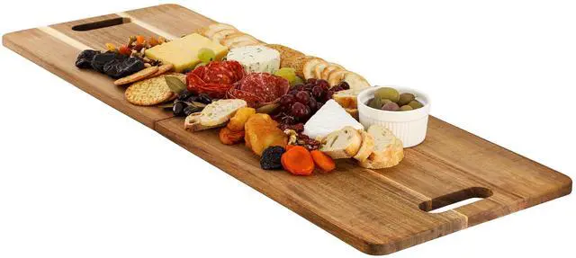 The MegaChef 33 x 12 Inch Acacia Wood Folding Charcuterie Serving Board is the ultimate centerpiece for any gathering, combining functionality with rustic elegance. Crafted from high-quality, durable acacia wood, this serving board boasts a natural wood grain that enhances its beauty while providing a sturdy surface for all your charcuterie, cheese, fruits, and appetizers. The board's generous 33 x 12 inch size offers ample space for an impressive spread, making it perfect for parties, family dinners, or special occasions. The unique folding feature allows for easy storage and transport, providing convenience without sacrificing style.