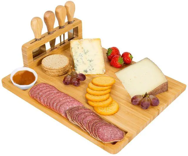 When tasting wine and cheese at home with family or friends, this bamboo cheese board is a great tool for you! Design with 2 slots and come with a detachable knife rack with 4 four knives and a dimming bowl, the set is ideal to serve your delectable cheeses, delicious meat, appetizers, sliders, etc. when picnic, travel or party. It's also a perfect gift for any cheese lover!
