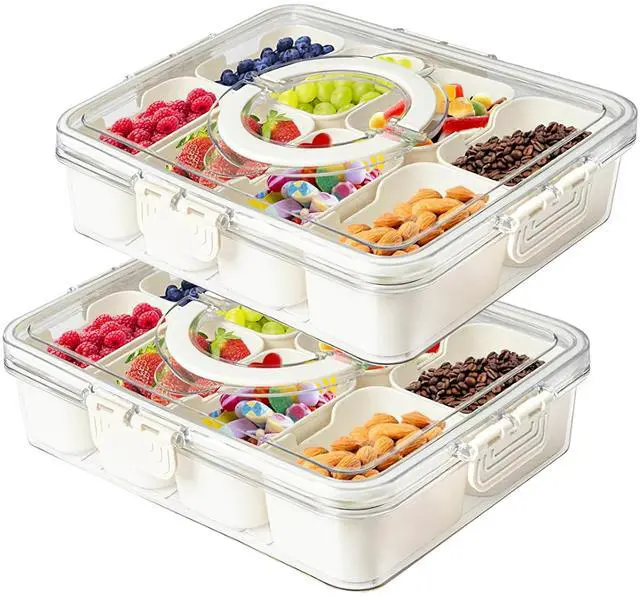 Separated & Removable Snack Container: Clear organizer designs with 8 removable compartments for candy, fruits, nuts, veggie and snacks. Ideal for organizing and carrying your favorite snacks, keeping food fresh and accessible. The separate design makes snacks and dried fruits better categorized without mixing the flavors.