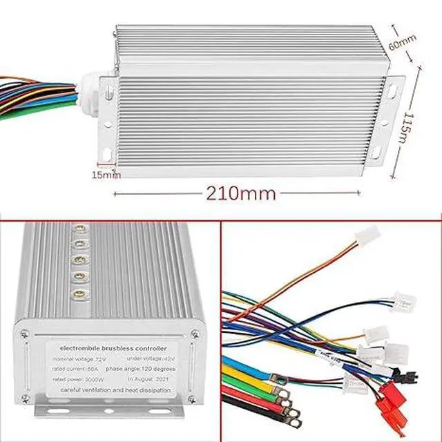 Brushless Motor Controller 50A, 48-72 volt, 3000 watt, 120°phase degree; Multifunctional intelligent controller Low-level brake, 3 Speed, Reverse, Brake Light, Indicator Light, Battery Charge and Ignition Lock;