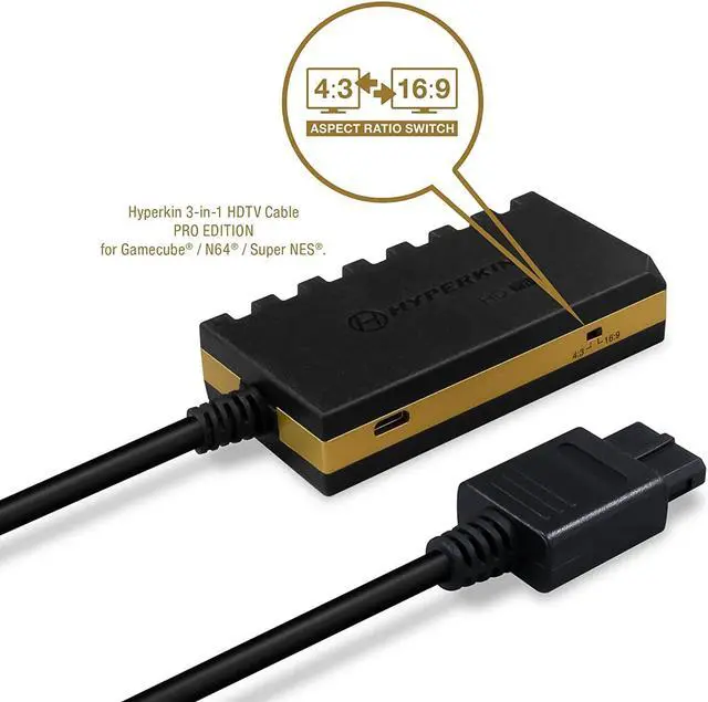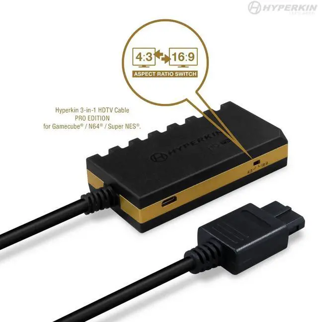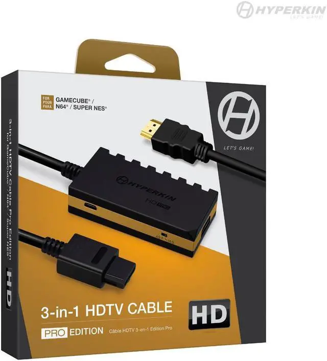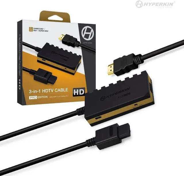 Hyperkin 3-In-1 720p HDTV Cable HD Pro Edition W/ 4 Visual Modes, No Additional Power Supply For GameCube/ N64/ Super NES M07552. Conveniently play three of your favorite consoles on your HDTV with the HD Pro version of our renowned 3-In-1 HDTV Cable. It supports 720p resolution (in 4:3 or 16:9 ) and crisp, stereo audio. A Mode button gives you 4 different visual styles to choose from, depending on your preference. No additional power source required!. Compatible with HDTVs via HD port (HD cable not included), Supports 720p resolution in 4:3 or 16:9 (via built-in Aspect Ratio Switch), Mode button switches between 4 different visual styles, Clear picture quality and crisp stereo audio, Note: May not work with some PAL consoles. Use at your own discretion.