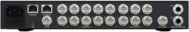 Configurable to 16, 13, 10, 7, or 4 up view, it includes monitoring of program, preview, inputs, media players, DSK, and clean feed with optional labels and audio meters.