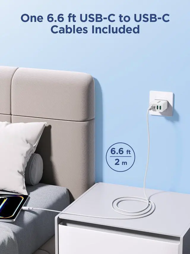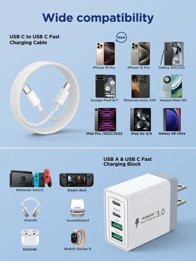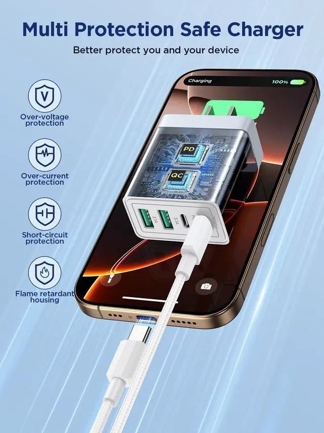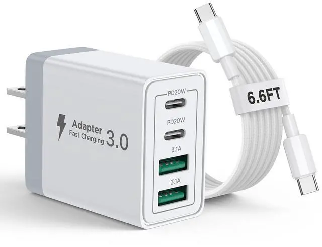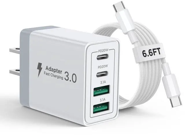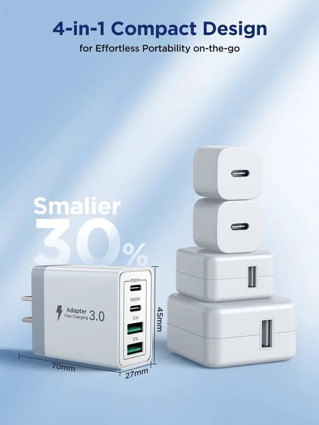 USB Wall Charger Multiport: iphone charger with Dual USB-C ports and Dual USB-A ports. Allow users to charge phone, tablet, laptop and headphones simultaneously to minimize waiting time. Its also a great space saver instead of taking up 4 wall outlet ports. The best replacement for your original usb charger