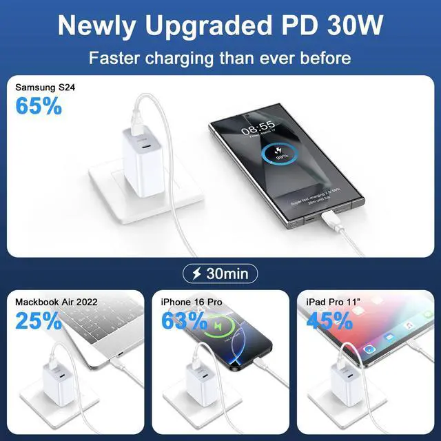 USB c fast wall charger plug provides max 30W output power, charging Samsung Galaxy S24 up to 60% in just 30 minutes, 100% charging about 0.8-0.9 hour.