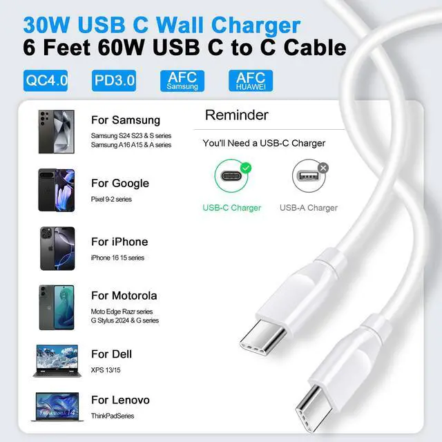 30W Dual Port Samsung Charger Super Fast Charging Block 6FT USB C to USB C Samsung Charger Cable