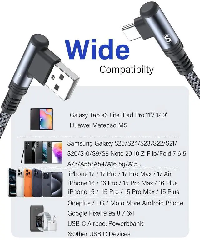 ![Alt view image 6 of 7 - iPhone 17 Charger USB to Type C Cable 90 Degree [2-Pack,6.6FT] Fast Charging Cord for iPhone 17 16 15 Pro Max Plus Samsung Galaxy S26 S25 S24 S23 S22 S21 S20 A54 A15 Note Flip LG Pixel Moto](https://c1.neweggimages.com/productimage/nb640/C3H5D26010204XX7283.jpg)