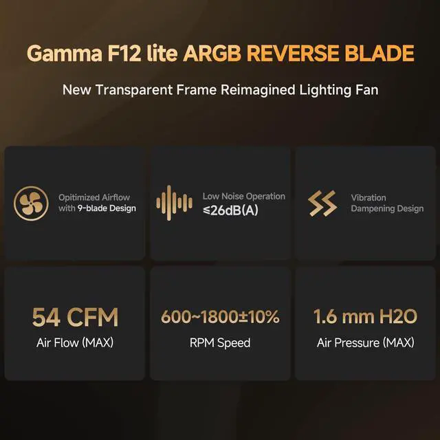 Gamma F12 Elite 120mm PC Fans, Up to 1800RPM 4pin PWM, Low Noise Computer Case Cooling Fan with Transparent Frame Design, 5V 3pin ARGB, 9-Blade Reverse (BK, 3PCS)