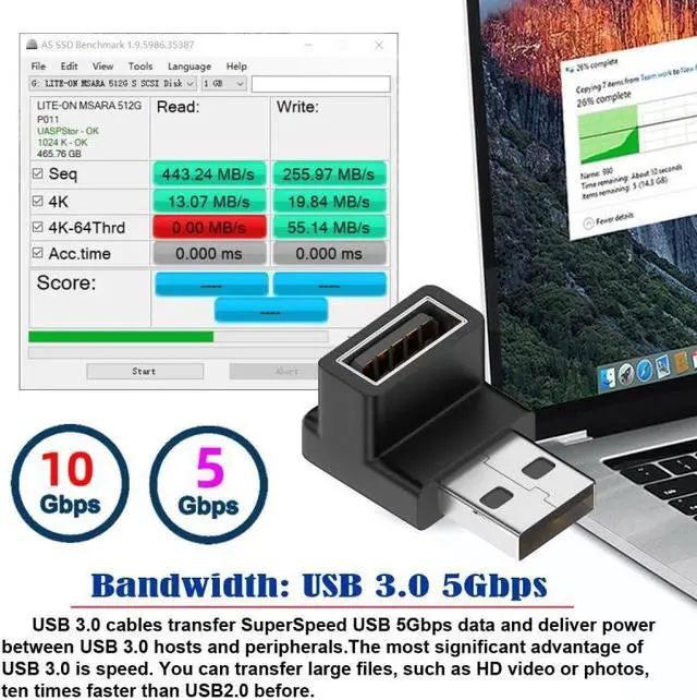 Angled USB 3.0 Adapter, Type A Male/Female, Support 10Gbps data transfer rating.
