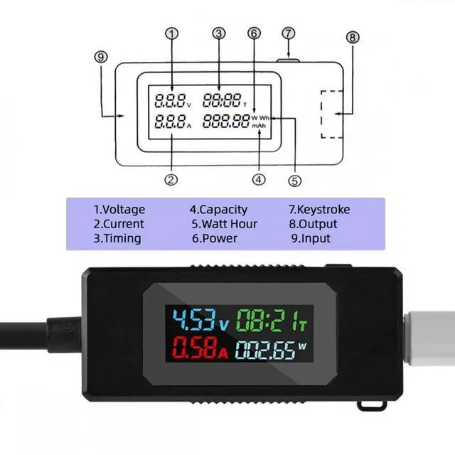 3) Multi-function: This USB tester is designed to detect voltage, current, capacity, electric quantity, power, temperature, resistance, charging time and other data of the USB C devices, which is convenient for testing power supply and quality.