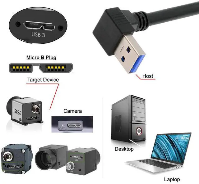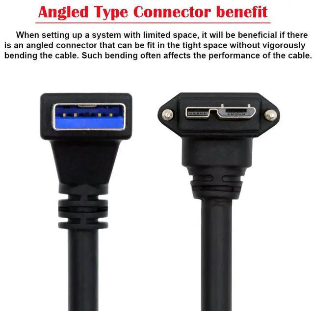 Down Angled 90 Degree USB 3.0 A Male to Micro-B 3.0 Plug Angled Locking Screw Panel Cable 25cmFor many applications, having a secured connection is extremely important. We manufactures a wide selection of high quality USB 3.0 thumbscrew locking cables. This Angled type Cable Allowing you to connect the cable to a female port, even if space around the port is limited. Angled Micro-USB side. You'll want to check your device to see which way the cable would exit when plugged in. Our newest design in USB to Micro USB 3.0 cables.