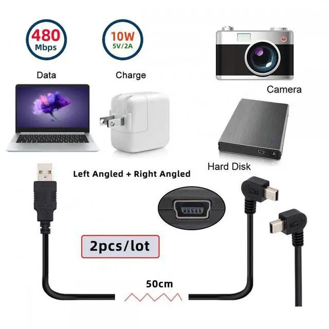2pcs/lot Left Right Angled Mini USB B Type 5pin Male 90 Degree to USB 2.0 Male Power Data Cable 50cm