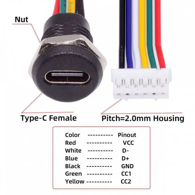 5pcs/set DIY OEM Type C Female Socket to 6Pin Header Cable Pitch= 2.0 mm Panel Mount DC 5V/20V PD Power