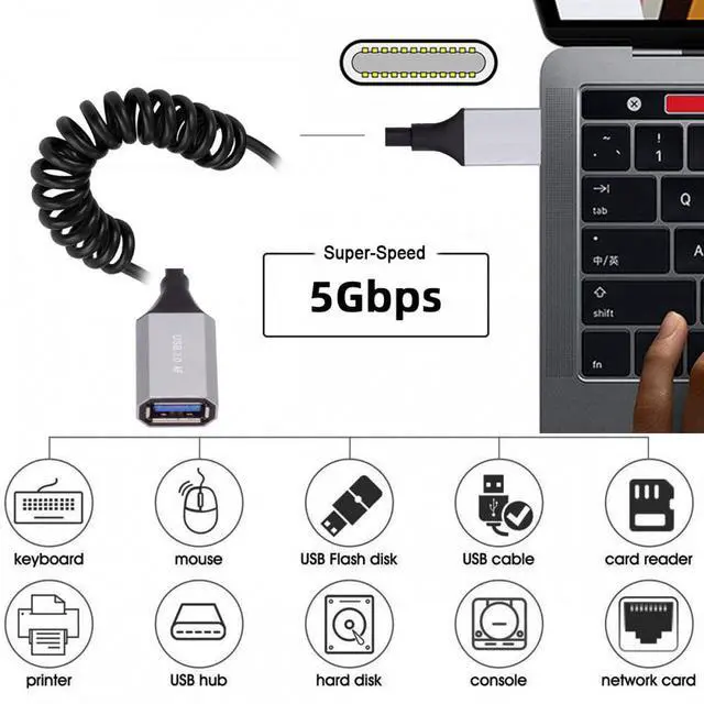 USB-C Type-C Host to USB 3.0 -A Female OTG Stretch Coiled Cable 100cm Extension 5Gbps for Disk Phone Camera Data