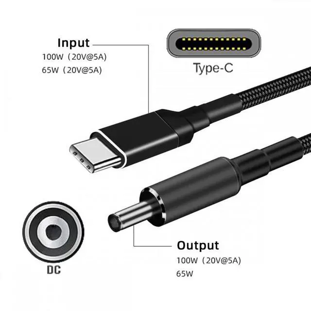 Type C USB-C Input to 20V DC 5.5 * 2.1 mm Output Power 100W 5A 65W PD Charge Cable for Laptop