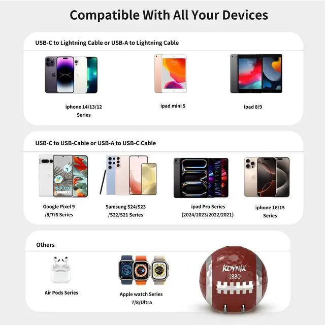 | Compatible Phone Models | Fast Charging, USB C Wall Charger Compatible with iPhone 17/17 Air/17 Pro Max/ 16/16 Pro/16 Pro Max/16 Plus/ 15 / 15 pro / 15 plus / 15 pro max /14 / 14 pro / 14 plus / 14 pro max / 13 / 13 Mini / 13 Pro / 13 Pro Max / 12 / 12 Mini / 12 Pro / 12 Pro Max / 11 / 11 Pro / 11 Pro Max / XR / X / Xs / XS Max / 8 Plus / 8 / 7 / 7plus / 6 / 6s / 6s Plus / 6Plus / 5s / 5c / 5 / SE(2016) / SE2(2020), i Pad Pro 9.7 inch (2016), i Pad Pro 10.5 inch (2017), i Pad Pro 12.9 inch (2017), i Pad mini / mini 2 / mini 3 / mini 4 (2015) / mini 5 (2019), i Pad Air / Air 2 / Air 3 (2019), i Pad 9.7 inch (2017), i Pad 9.7 inch (2018), i Pad 10.2 inch (2019,7th generation), i Pad 10.2 inch (2020,8th generation), Air Pods 1 / Air Pods 2 / Air Pods Pro, Google Pixel 5 / 5XL / 4a / 4XL / 4 / 3a XL / 3a / 3 XL / 3 / 2 XL, Galaxy S20 / S10 / S10e / S10+ / S9 / S8, Note 9 / 8, LG G5 / G6 / G7 / V20 / V30 / V40 / V50 / ThinQ and more |