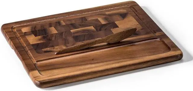 A perfectly sized and beautifully designed cheeseboard featuring gorgeous end grain wood and matching acacia wood knife. The knife fits conveniently in grooves between the two sections. Delight your guests by serving cheese, crackers, hor d'oeuvres, or any appetizer on this elegant cheeseboard. Turn it upside down for the perfect cutting board! Classic design focuses on the natural element of the wood. Made from environmentally friendly Acacia wood. Distinctive grain.