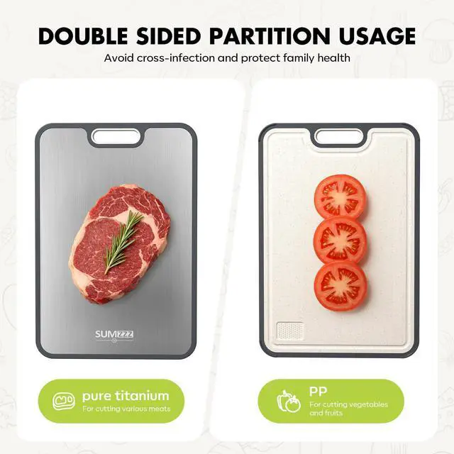 2 IN 1 Cutting Board Cutting board is a versatile 2 in 1 kitchen tool, with one side made of food-grade 99.9%Pure Titanium for cutting raw and cooked meat, and the other side made of PP material for cutting vegetables and fruit.