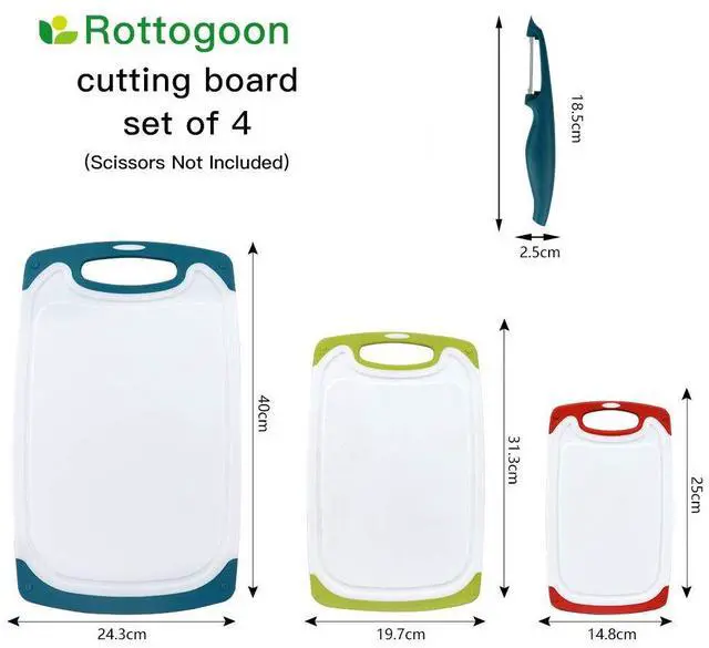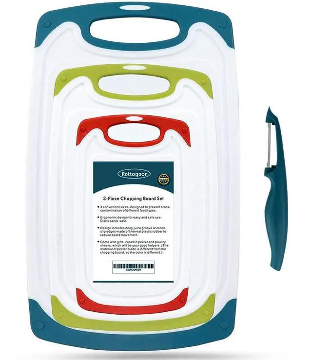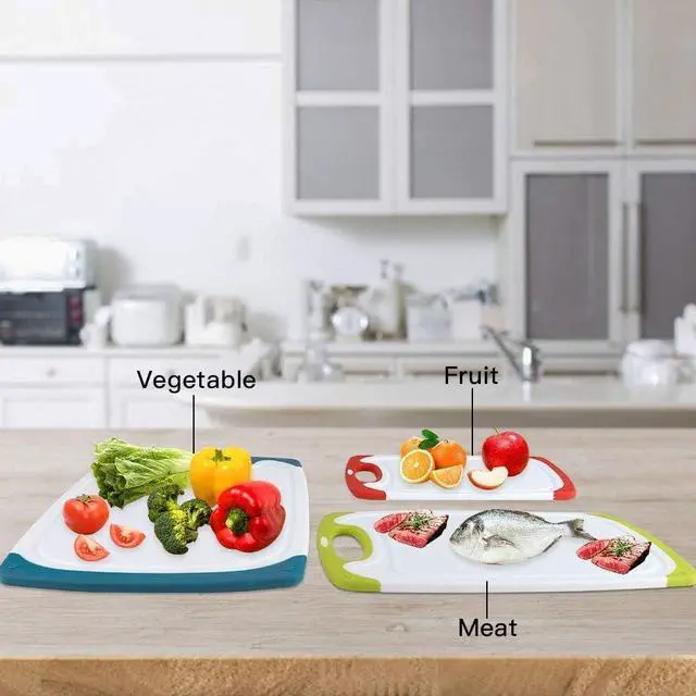 The Plastic Cutting Board features a soft, tapered grip and non-slip edges that keep the surface from sliding on countertops.Each cutting board has four rubber feet .which makes it safe to use on any kitchen surfaces.