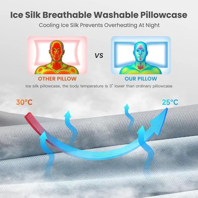 Breathable and Soft Pillowcase The pillow comes with a removable, machine-washable silk cover made from soft, with sweat and moisture absorption properties, breathable materials that keep you cool throughout the night, ensuring a fresh, clean sleeping environment.