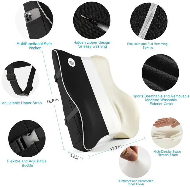 - Lumbar support pillow is ergonomically designed to fit the streamline of your spine curve,contoured design effectively helps realign your back and spine,it can sufficiently alleviate the pain and fatigue of lumbar and vertebra area -Prevents muscle fatigue and tightness in your back -Promotes good posture and proper spine alignment -Relieves pressure points and increases blood flow,support the whole back,especially the low waist and the waist side.Due to the thick sides,it can brace the waist.Let you sit comfortably!