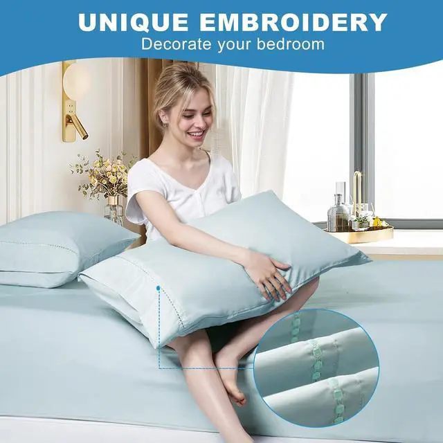 Let you enjoy a gentle and comfortable sleeping experienceEmbroidery & Envelope Design - This soft embroidery pillowcase features a secure envelope closure which not only makes the pillowcase look beautiful and safe to use but also increases its aesthetic appeal. It also helps to avoid facial injuries caused by accidental contact with hardware. The unique wide opening design makes this cooling pillow protector very easy to change the pillowcase. It also prevents dust and dirt from entering and extends the life of the pillowEasy Care and Cleaning - Our bed pillowcase can help those hot sleepers stay cool in the summer the cooling fiber material is special but easy to maintain.
