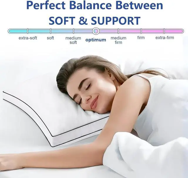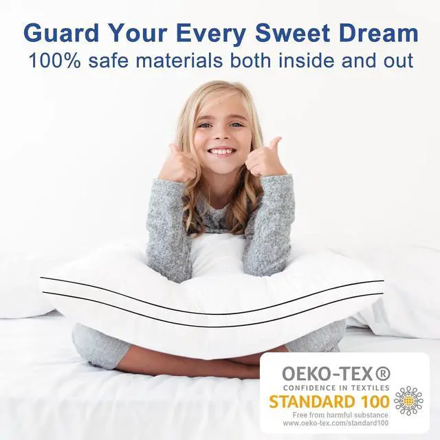 ? Reliable CertificationThe pillows have the OEKO-TEX Standard 100 certification indicating that the products do not contain any harmful chemicals and meet the safety and environmental standards of the test. You can use the products with confidence.? Double Edge Sewing DesignExquisite double edge sewing design and detail handling and black double edge to create hotel-level luxury style. Let you enjoy the hotel quality pillows sleep experience.? Simple Care ModeDue to vacuum packaging please open the pillow before use and leave it for 24 hours before use. After patting the pillow will return to the fluffy state.