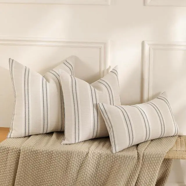 LinenSize & Material Pack of 2. 20 x 20 (50cm*50cm). Please allow 1~2cm deviation because of hand-cutting and sewing. 100% Linen. COVER ONLY. Pillow Inserts are not includeTimelessAdd timeless casual elegance to your living room or sitting space with this farmhouse pillow covers. The square throw pillow covers is sure to add the right amount of comfort and style to your sofa chair or bench. Linen Woven DesignThis double-sided throw pillow is decorated with woven stripes on a linen background to complement farmhouse cottage or coastal aesthetics. Indoor & Outdoor Pillows Refresh your accenting bed garden couches chairs or sofas with these pillow covers or entryway seating arrangement for simple and stylish decorationsalso a perfect gifts.