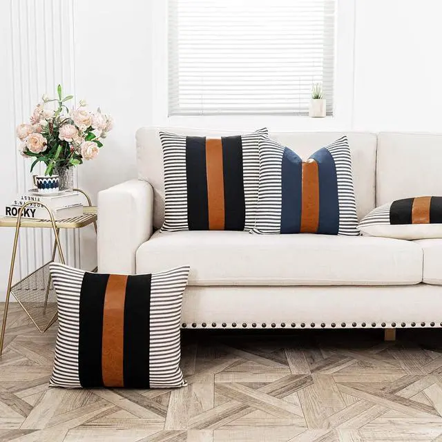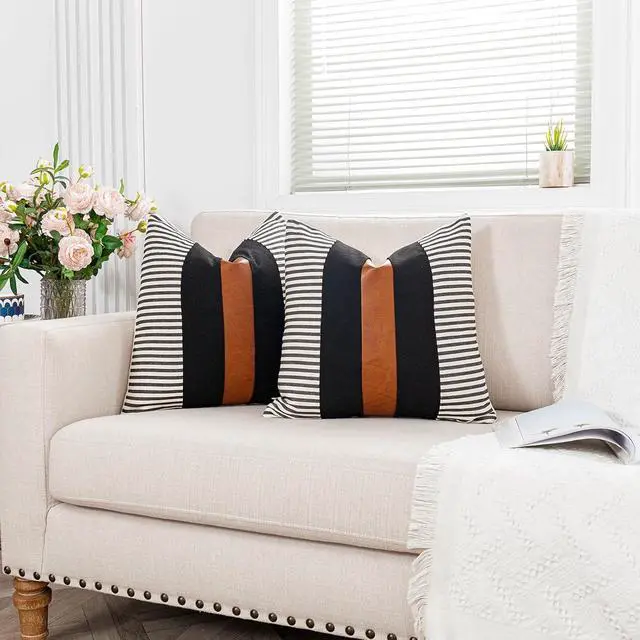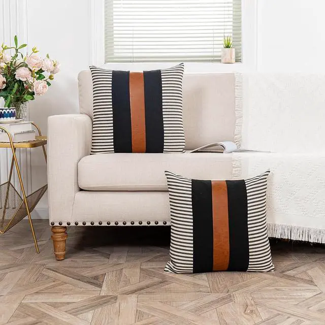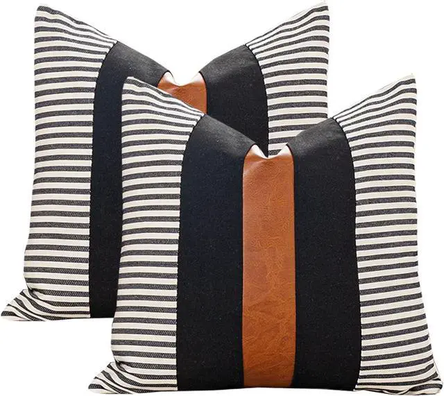 Faux Leather + Cotton LinenMaterial & Size- Front side of these farmhouse stripe pillow covers are made of high quality cotton fabric patchwork with faux leather accent decor. Backing is natural cotton fabric. Packaged included pack of 2 modern accent pillow covers 20 x 20 Inch / 50 x 50 cm. Covers ONLY NOT include insert. Chic Design - This decorative boho pillow cover features a color-blocked design made with classic stripe and solid black. The leather accent on this stylish decorative farmhouse throw pillow covers adds an element of class a stylish blend of modern and classic.