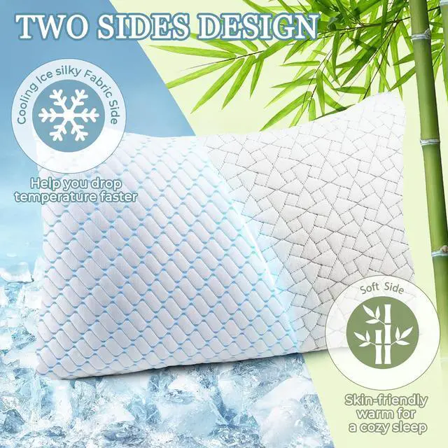 Double Side Design: Our cooling pillows are crafted from premium Soft & cooling material the memory foam pillow 2 pack are ultra-soft offering a luxurious sleeping experience akin to resting on a cloud. The Soft side is made of 45% soft rayon and 55% polyester and The the cooling side is made of ice silk fabric which are breathable and soft to the touch. Both are removable and machine washable in cold water ensuring easy care. Best Gel Bed Pillow for