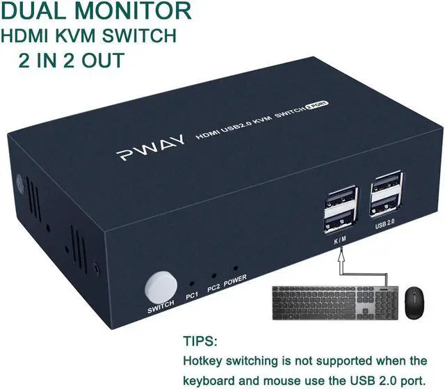 You can enjoy the most luxurious video with this HDMI KVM dual monitor Switch. ??HOTKEY SWITCH??You can choose hotkey switch (Press scroll lock+ scroll lock+1/2), you also can switch the two signal sources by the panel buttons, the status light tells you which port is active.