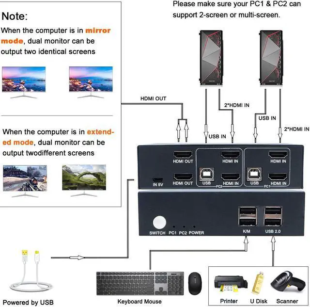 Special Note: Hotkey switching is not supported when the keyboard and mouse use the USB 2.0 port. ??POWERED BY USB??It means powered by USB cables, no need external power adapter, just connect you switcher devices to enjoy, it make you work and life easier and simpler. Come with 1 Micro USB power cord for power supply. ??PLEASE NOTE??Please note that in the premise that the supports dual display or multi-screen display, the extended mode can output two different screens, and the copy mode can output two identical screens; If your computer only supports single display, then this product cannot help you get dual display function. Please make sure that all cables are connected tightly, and make sure that all cables are good. If you have any questions about the product, please contact us.