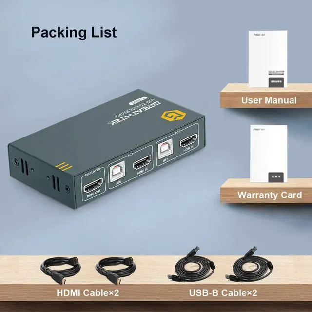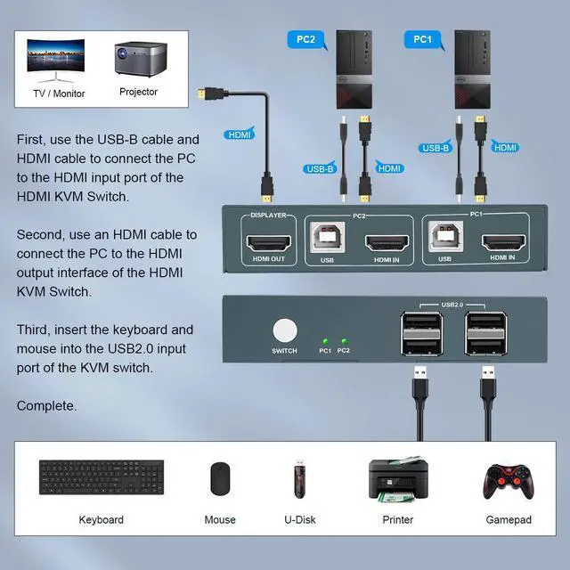 2 IN 1 OUT KVM Switch GREATHTEK HDMI KVM Switch USB 2 Port 4K, USB2.0, 4K @30Hz, KVM Switch 2 PC 1 Monitor, Ultra HD, with 2 USB and 2 HDMI Cables 2 IN 1 OUT-The HDMI KVM Switch 2 Port can 1 Set Of Keyboard & Mouse Control 2 PCs Share 1 Monitor, which can support the use of wired/wireless/mechanical keyboards.