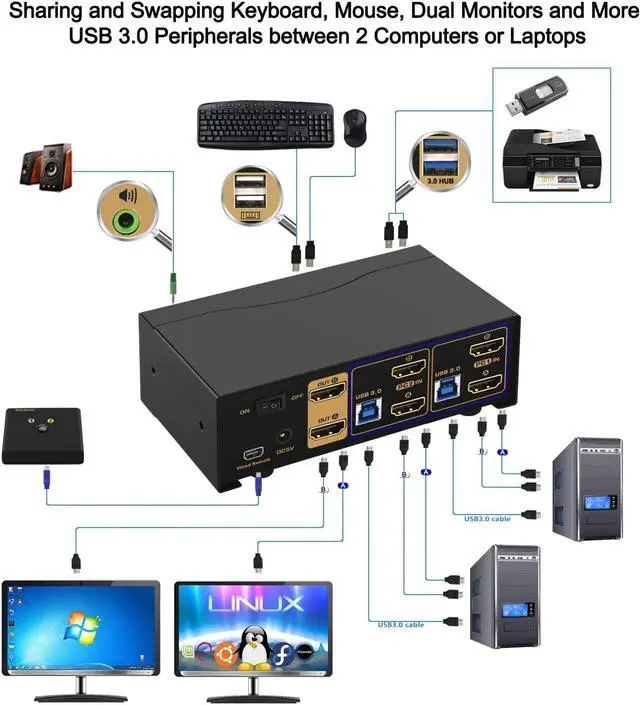 • USB 3.0 KVM SWITCH 2 Monitors - Most KVM Switches out there are USB 2.0 version, with this one you not only get 2 extra USB 3.0 HUB ports for up to 5Gbps/s data transferring rate (10 times faster than USB 2.0), but also swapping higher capacity USB devices like webcam, headset, hard disk, printers etc. between 2 PCs instantly;