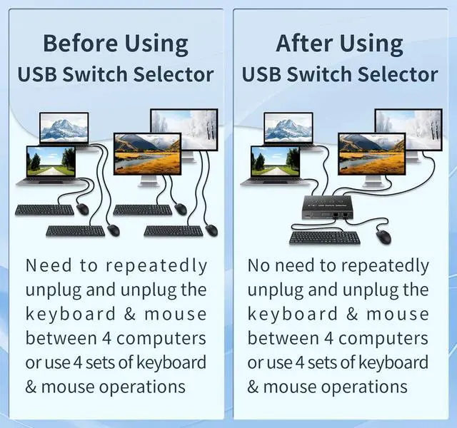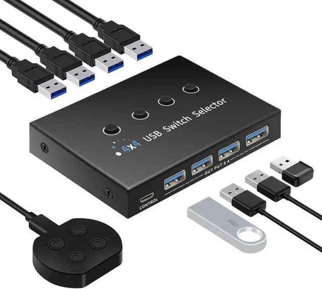 The 4 port USB switcher supports one set of keyboard and mouse to control up to 4 computers, sharing 4 USB3.0 devices .One-button switching, plug and play
