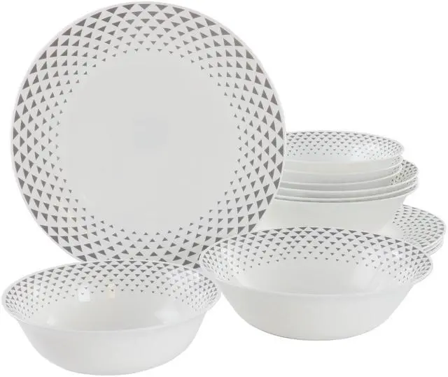 Set the table for a delicious meal using this Ultra by Gibson Cane Peak 12 Piece Opal Glass Dinnerware Set. This set features four of each fruit bowls, cereal bowls, and dinner plates so you can perfectly serve up to four people. Made of durable opal glass material, these dishes are break resistant so you can enjoy them for years. A smooth, high gloss finish makes these dishes non-porous meaning they are a breeze to clean up and dishwasher safe. In addition, they are microwave and freezer safe making them versatile for everyday use.