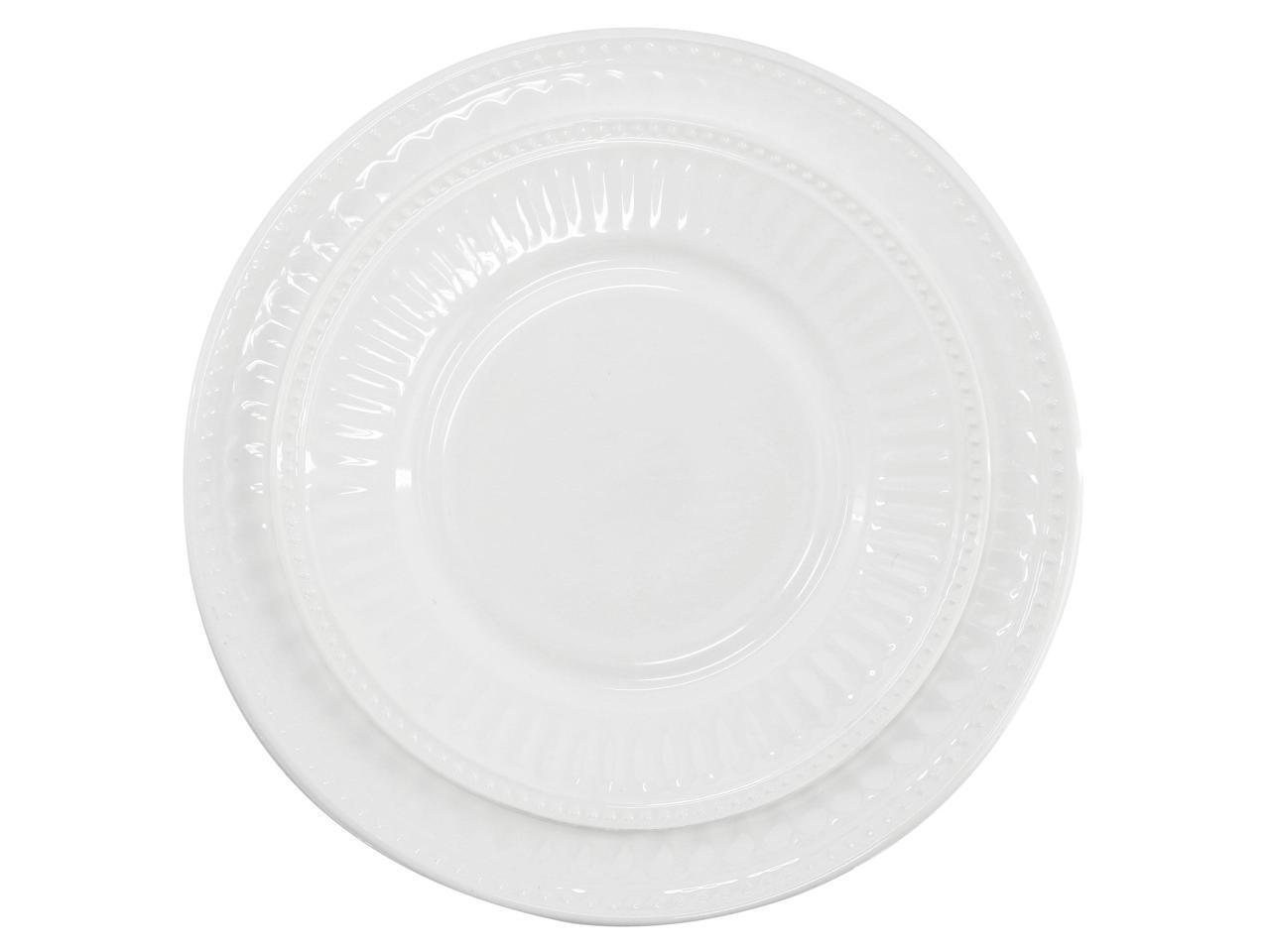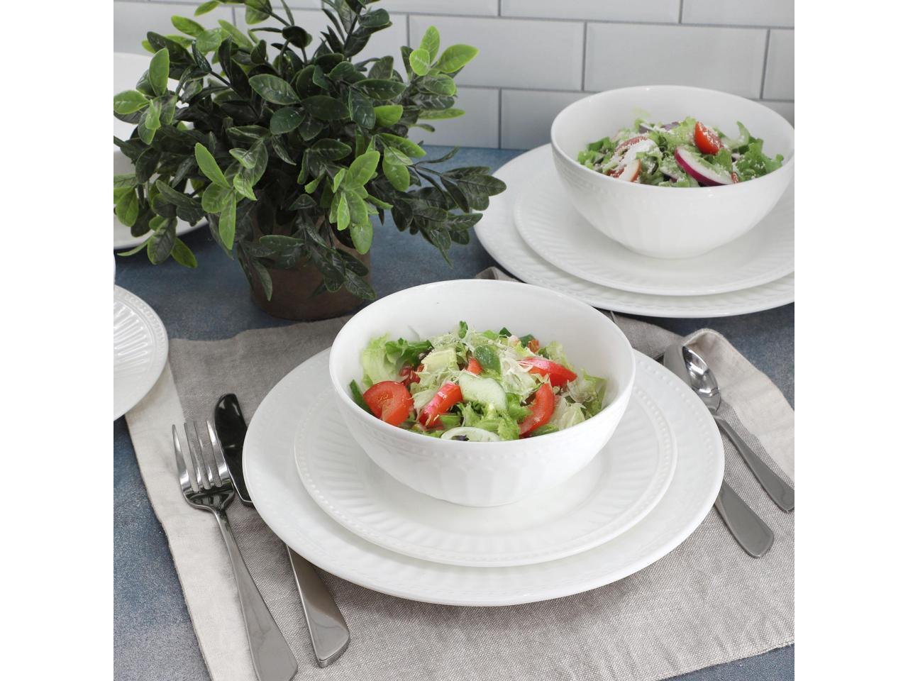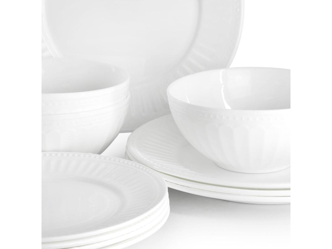 Set includes: four dinner plates, four dessert plates, and four bowls