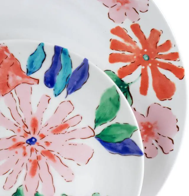 The Gibson Home Dazzling Lily 12 Piece Ceramic Dinnerware Set is a colorful extravaganza that will draw the crowd to the dinner table. The fine ceramic dishes showcase a watercolor style plant design over a white base color. These plates are dishwasher safe for easy cleaning and microwave safe for convenient reheating. Their round shape efficiently holds sauces and juices while perfectly framing meals. Serve with this set for any occasion, from casual lunches to formal dinners.