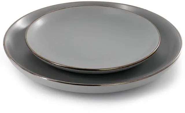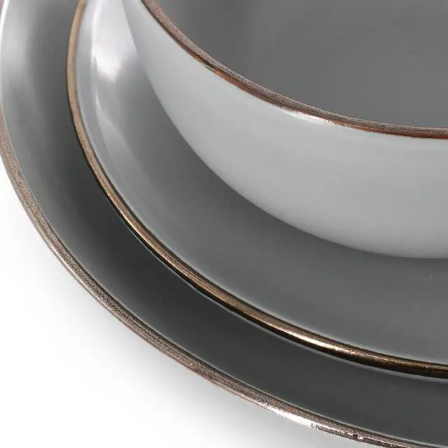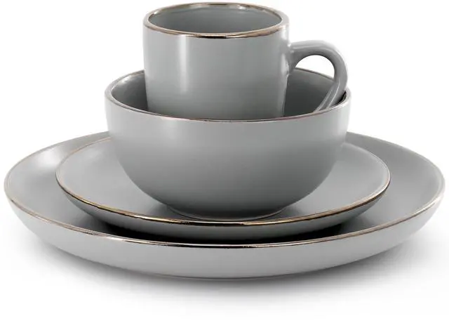 The Gibson Home Rockaway 16 Piece Gold Rimmed Dinnerware Set will dazzle the kitchen table without overpowering the table setting. Features a painted gold rim with a taupe base plate. The stoneware material allows for dishwasher use for easy cleaning as well as microwave use. Bring out this set for any occasion, be it to impress special guests or to spruce up daily dinners.