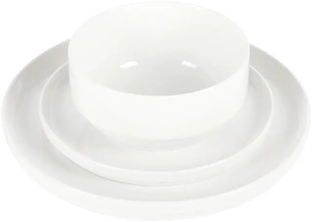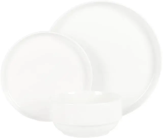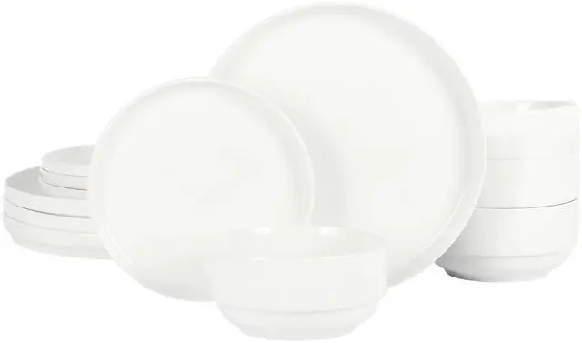 Enjoy a delicious dinner on this Gibson Home Snowscape 12 Piece fine Ceramic Stackable Dinnerware Set. Including four of each dinner plates, dessert plates, and bowls, you'll have a full set for a meal with family. Constructed from durable fine ceramic, these dishes are sturdy, and being dishwasher and microwave safe makes them great for everyday use. The sleek white color will look amazing on any table setting and nicely complement any food.
