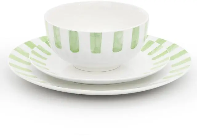 The Gibson Home Pacific Waves 12 Piece Round Ceramic Dinnerware Set brings together sleek design and everyday practicality. Each piece is crafted from durable ceramic, finished with a glossy shine and adorned with a distinctive striped rim pattern that adds a modern accent. The classic round shape ensures this set fits seamlessly with a variety of table settings, whether for casual meals or special gatherings.