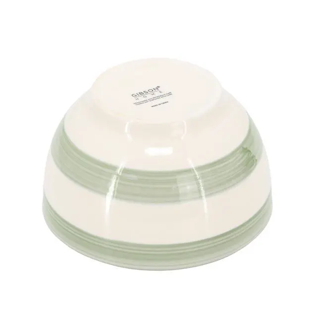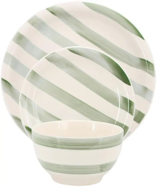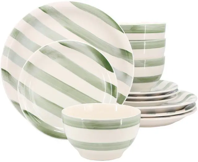 The Gibson Home Kenwood Shores 12 Piece Stoneware Dinnerware Set brings a blend of artisanal charm and everyday functionality to your dining table. Crafted from durable stoneware with a glossy finish, this set features a handpainted stripe pattern that adds a touch of rustic elegance to any meal. Designed for service for four, it includes four 10.5-inch dinner plates, four 7.5-inch dessert plates, and four 5.5-inch cereal bowls, making it perfect for casual family dinners or entertaining guests. The round shape and carefully crafted design create a cohesive and inviting table setting.