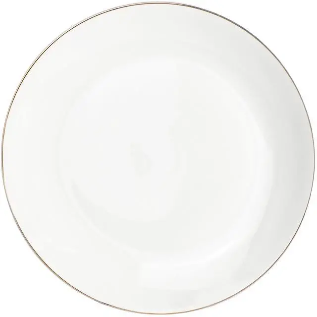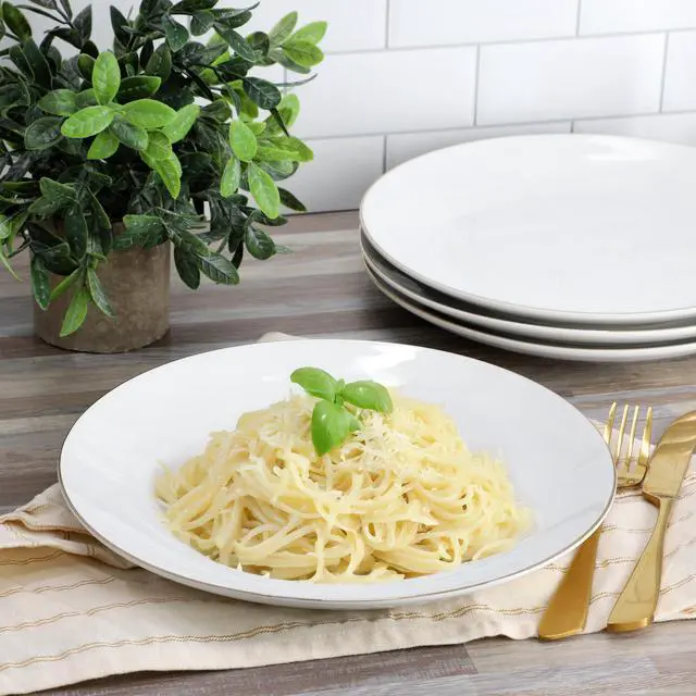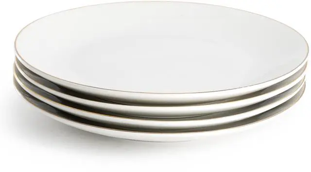 Elevate your dining experience with the Gibson Home Ogalla 4 Piece Fine Ceramic 10.5 Inch Dinner Plate Set in White with Gold Rim. This elegant dinnerware set includes four 10.5-inch dinner plates, each crafted from premium fine ceramic for lasting quality and sophisticated style. The classic white finish is beautifully accented with a delicate 1.5mm gold banding detail, adding a luxurious touch to any table setting-perfect for both everyday meals and special occasions.