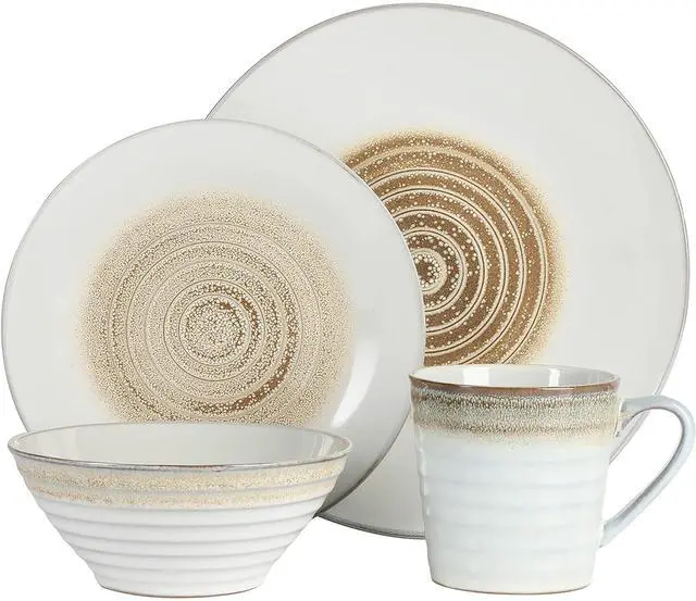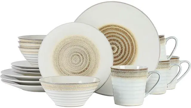 Add a touch of elegance to your dinner table with this Gibson Elite Spiral Embossed 16 Piece Stoneware Dinnerware Set. A gorgeous and unique spiral embossed texture with a delicate speckled reactive glaze rims makes these dishes the center of attention during any meal. The sturdy stoneware construction will last for plenty of years and being dishwasher and microwave safe makes these convenient for everyday use. In this set, you'll receive four of each matching dinner plates, dessert plates, cereal bowls, and mugs. Welcome this beautiful farmhouse inspired dishes into your home today!