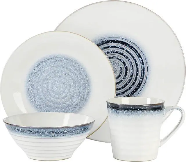 Add a touch of elegance to your dinner table with this Gibson Elite Spiral Embossed 16 Piece Stoneware Dinnerware Set. A gorgeous and unique spiral embossed texture with a delicate speckled reactive glaze rims makes these dishes the center of attention during any meal. The sturdy stoneware construction will last for plenty of years and being dishwasher and microwave safe makes these convenient for everyday use. In this set, you'll receive four of each matching dinner plates, dessert plates, cereal bowls, and mugs. Welcome this beautiful farmhouse inspired dishes into your home today!