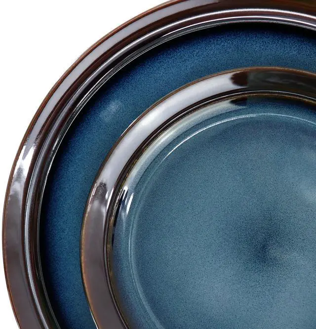 Sit down and enjoy your every day meals in style with this Gibson Elite 16 piece Priya dinnerware set. Each piece in this set is finished in a reactive glaze that adds a special touch to your meals. The original artistry of the reactive glaze finishing technique produces unique differences in color, design, and texture, ensuring artisanal dinnerware with depth. The bowls and plates in this set feature a metallic brown rim for added shine. Constructed of durable stoneware that is meant to last, this set is dishwasher and microwave safe for easy reheat and cleanup.