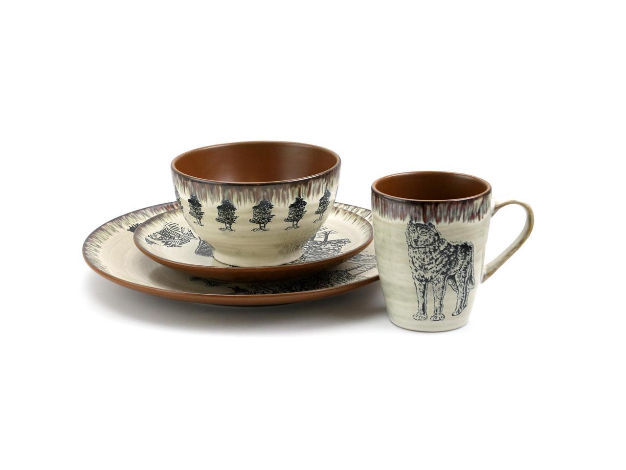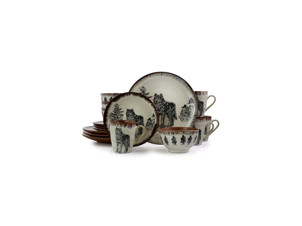 Elama Majestic Wolf 16 Piece Luxurious Stoneware Dinnerware with Complete Setting for 4