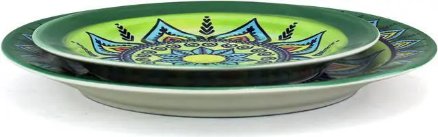 The Elama Zen Green Mozaik 16 Piece Dinnerware Set is a lovely addition of color for your table. Whether you choose to host a large party or enjoy an intimate meal in your home, these plates will brighten up your day with colorful and vibrant tones and intricate bohemian style. While this dish set for 4 is a wonderful way to serve many meals, it's designed to be versatile and can easily double as serving-ware. This stoneware collection is also both dishwasher and microwave safe making clean up and reheating simple and efficient.
